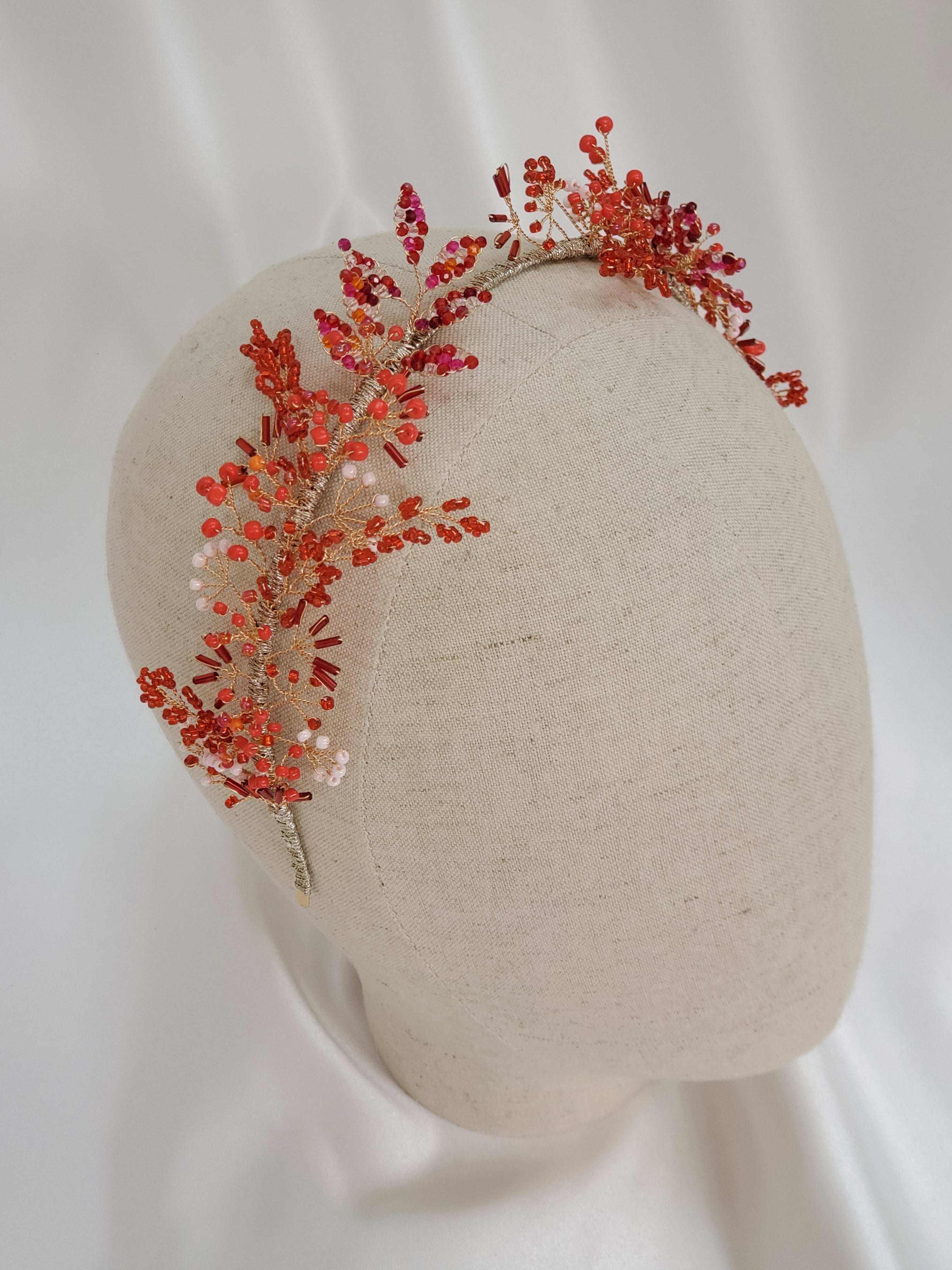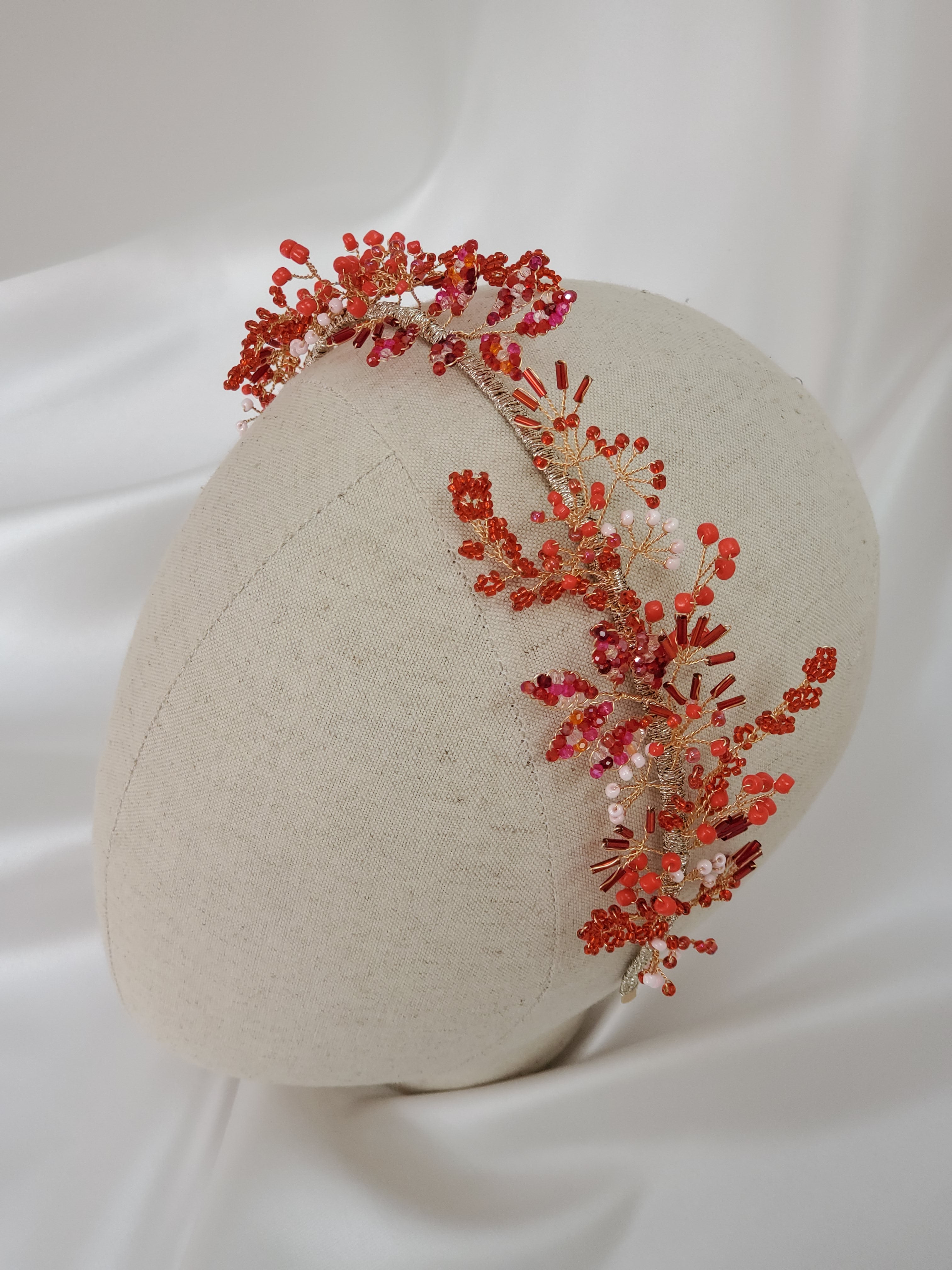 Make a dainty yet captivating statement with the Rosie Crown headpiece, an elegant crown blooming with color. The base is an intricate network of fine French beading, featuring genuine Swarovski crystals and Czech beads in various shades of red. This meticulous wirework is accented by beautifully sculpted clay flowers, which lend a romantic and natural feel. The delicate nature of the crown ensures it feels lightweight and comfortable to wear, while the vibrant color palette makes for a stunning and memorable bridal accessory.