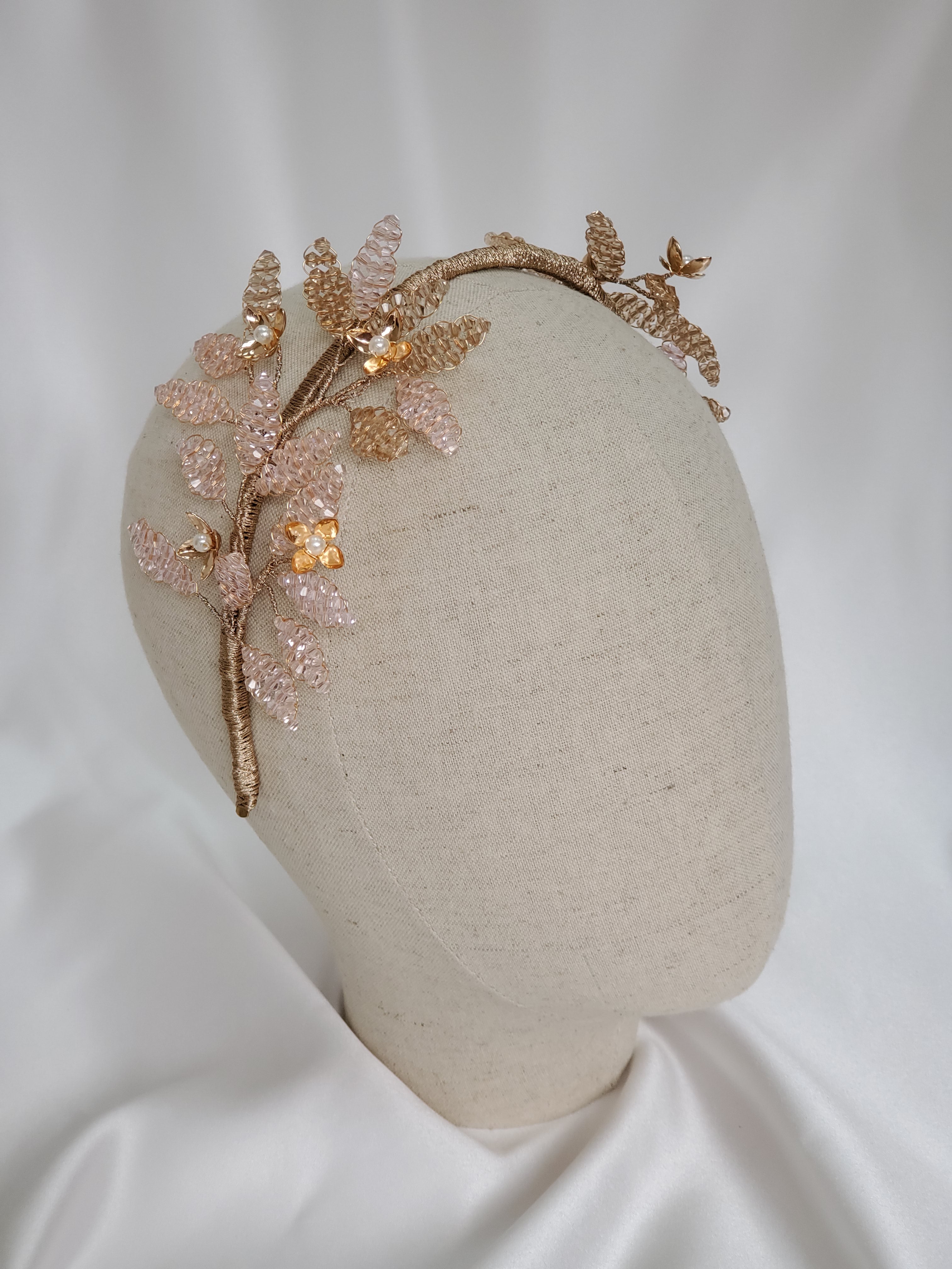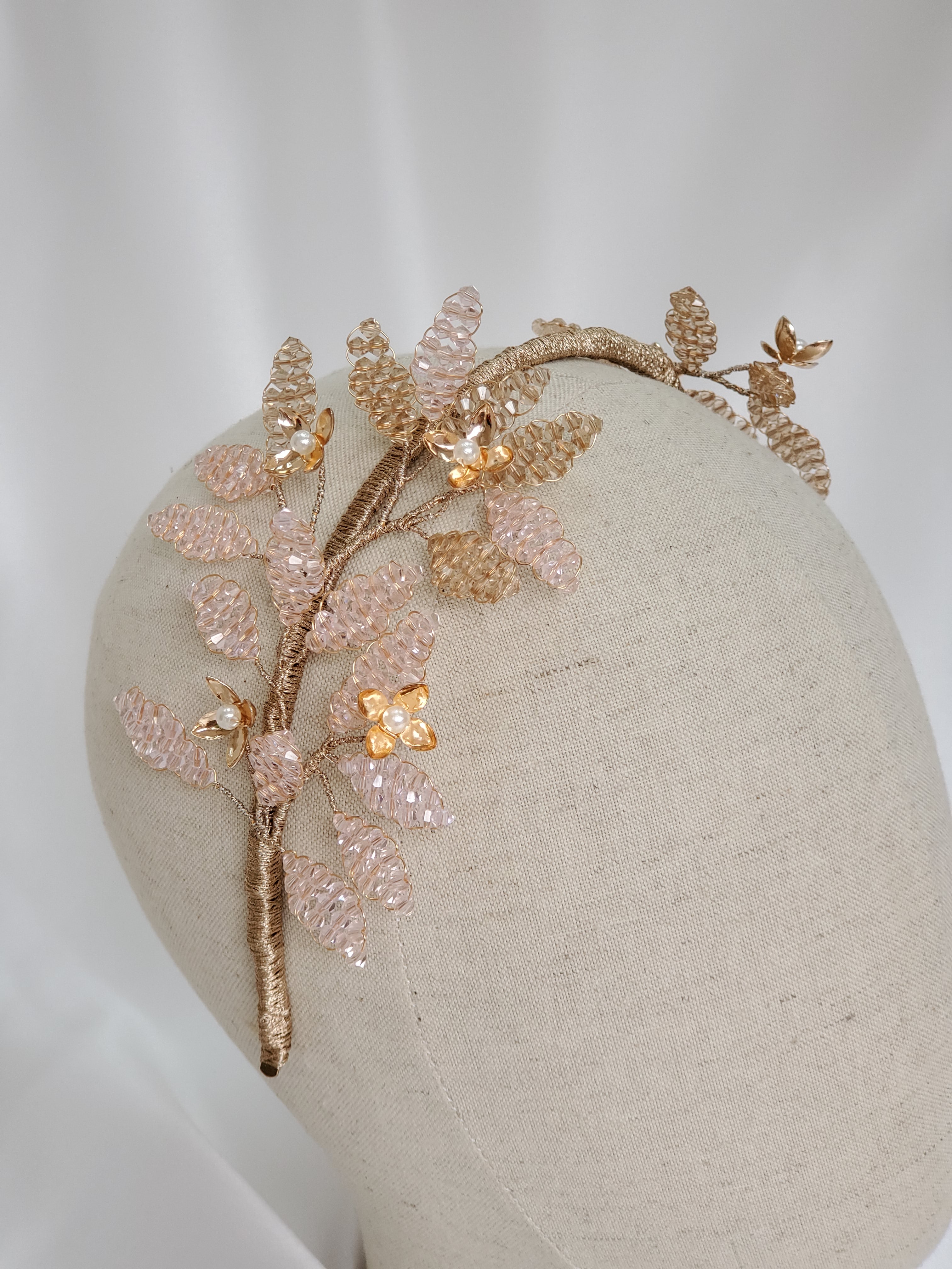 Capturing the soft romance of a blossoming garden, this exquisite French beaded headpiece is a stunning cascade of light and color. Delicate vines, meticulously wired with layers of luminous pink and beige Swarovski crystal beads, gracefully trail along both sides of the head. Glistening gold flowers, each with a brilliant pearl bead at its center, are nestled amongst the beaded vines, adding a touch of timeless elegance. The band is finished with a fine gold yarn thread, creating a seamless and comfortable fit. This piece is a true testament to artisanal craftsmanship and perfect for the bride seeking a unique, blush-toned accessory.