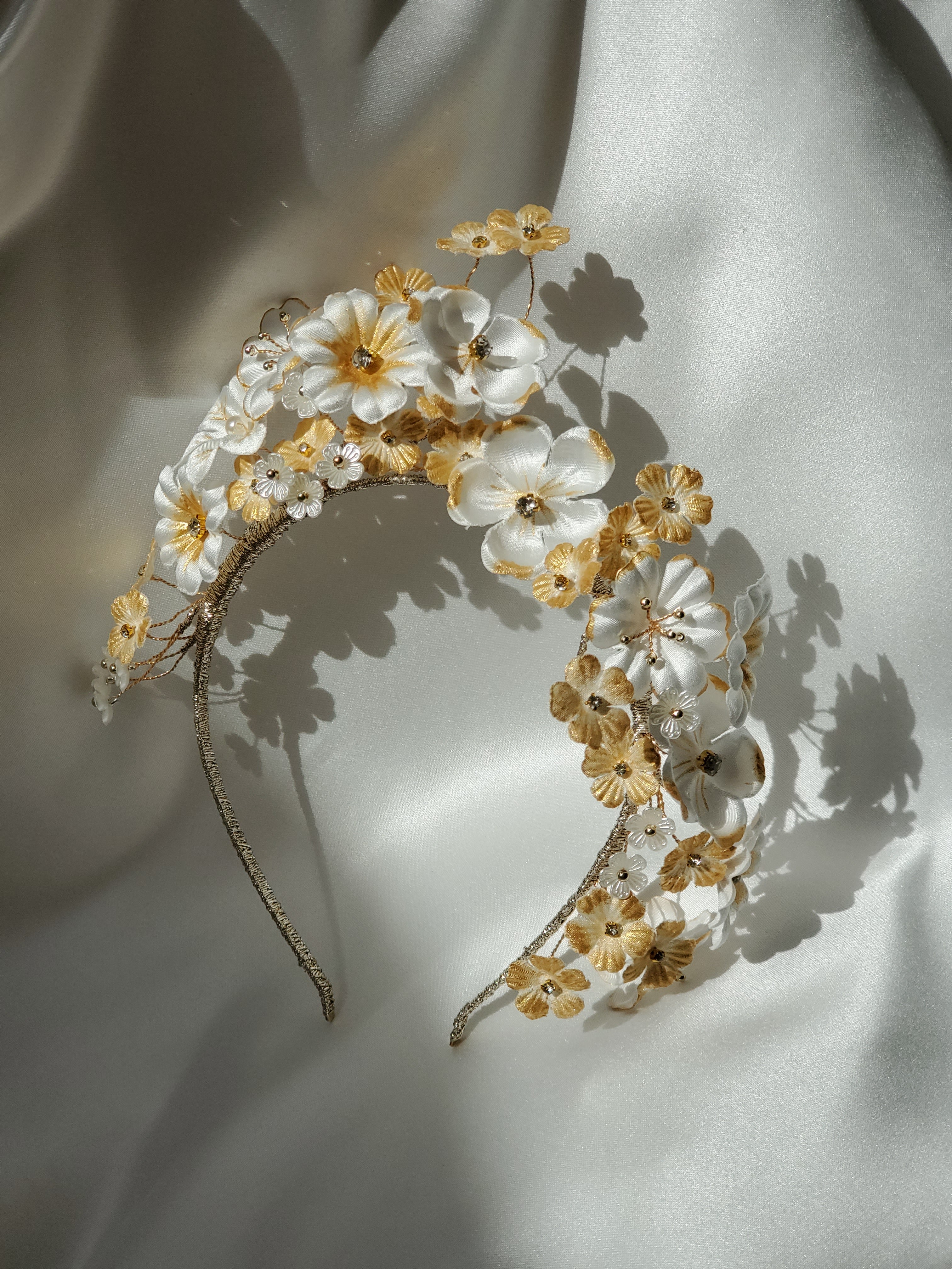 Make a truly glamorous statement with this luxurious, handcrafted headpiece. An organic arrangement of soft, fabric petals, each hand-painted with a rich, metallic gold sheen, creates a breathtakingly modern and elegant silhouette. The petals are artistically placed to cascade across the top and side of the head, catching the light and adding a radiant glow to your face. This versatile piece pairs beautifully with any gown, from a sleek, minimalist design to a lavish, textured masterpiece, ensuring you shine with sophisticated style at any special event.