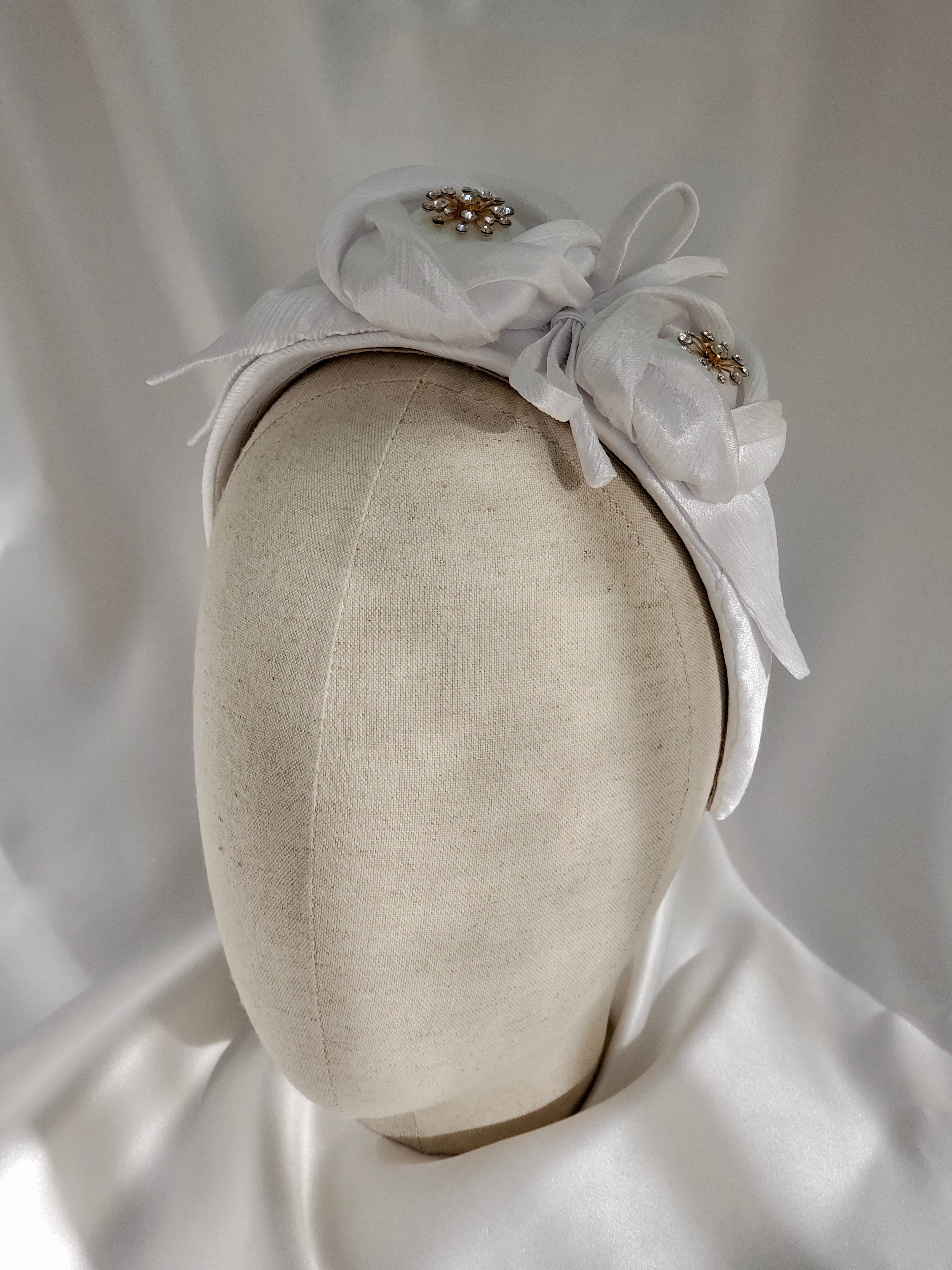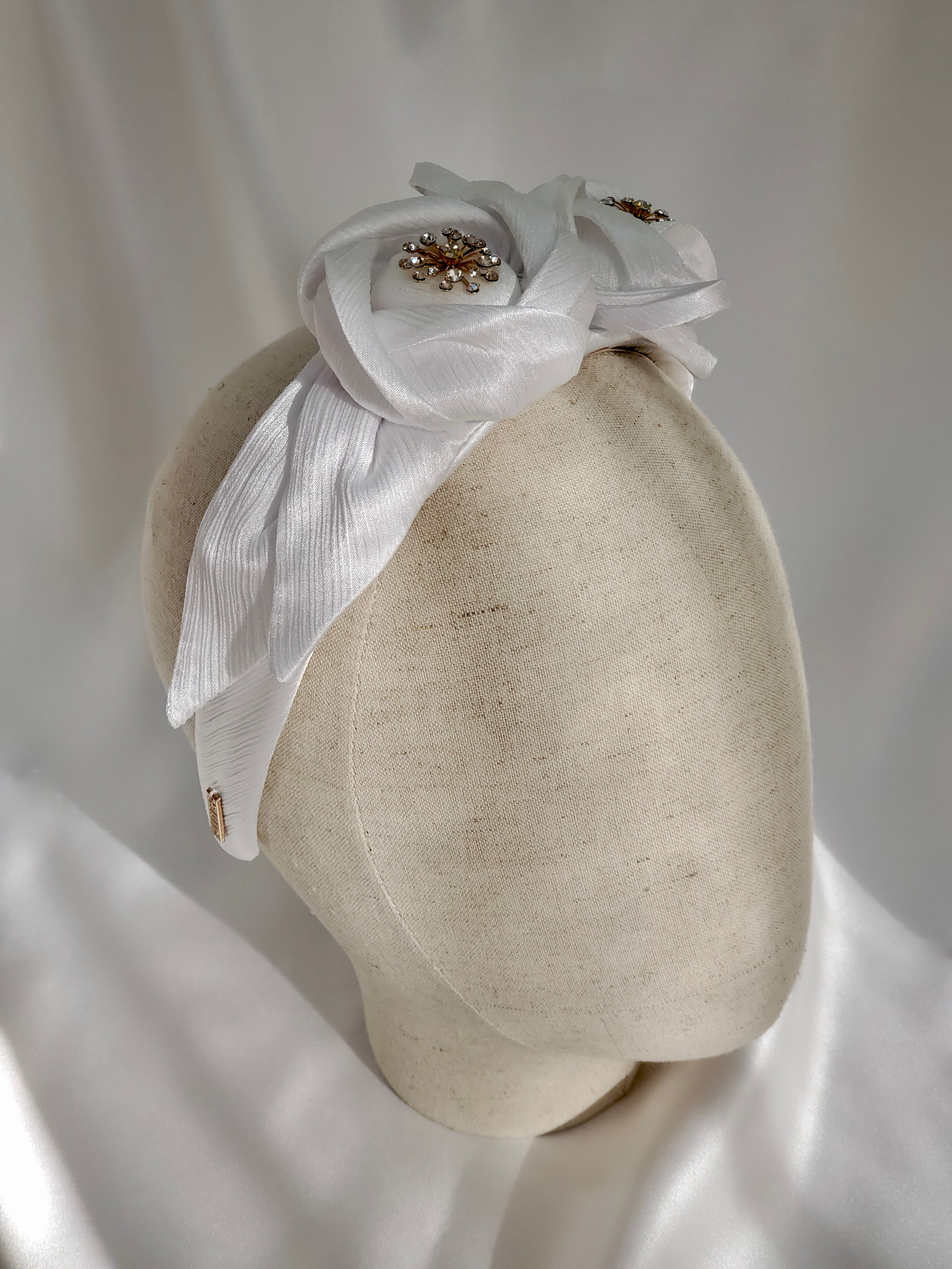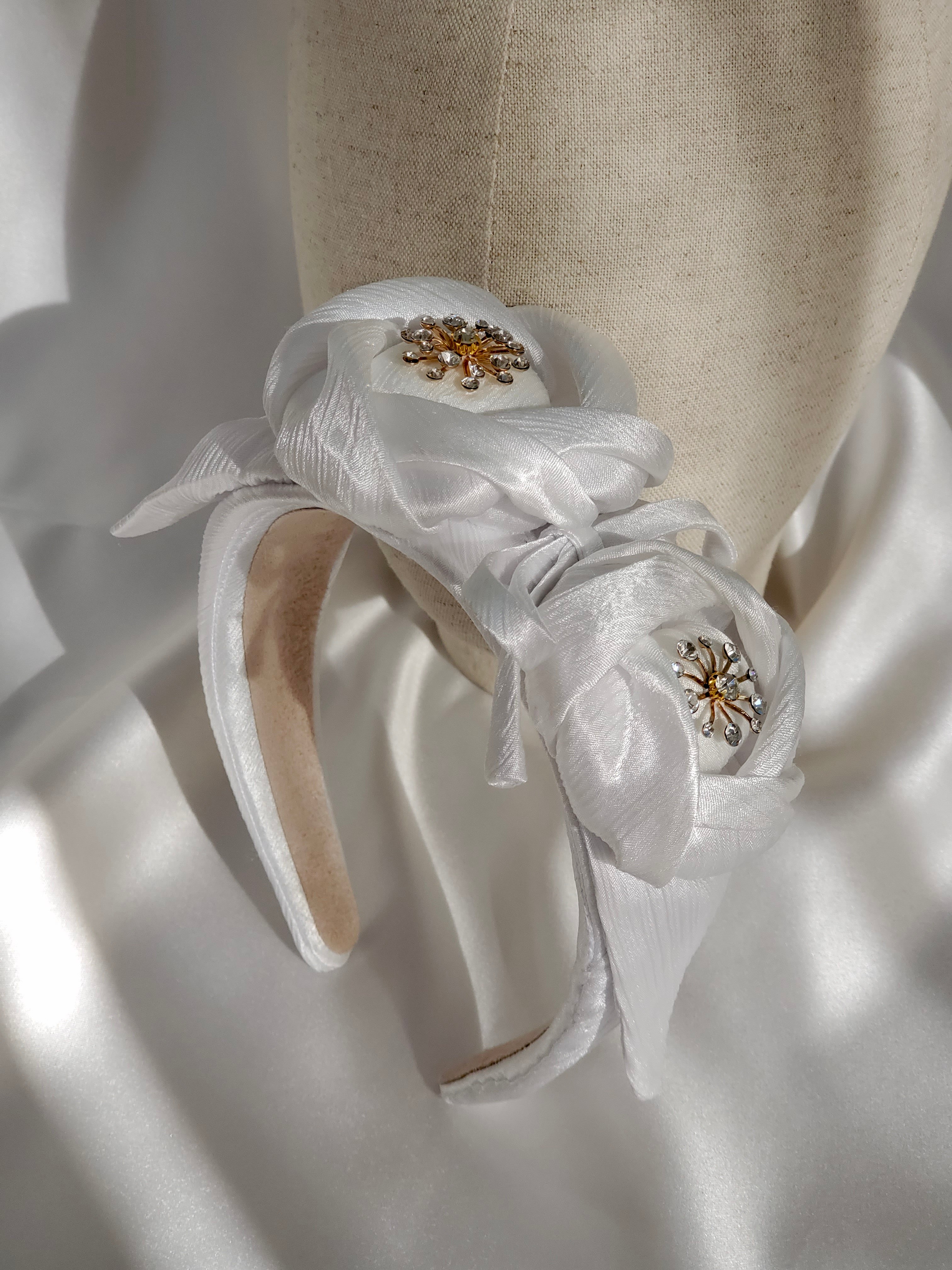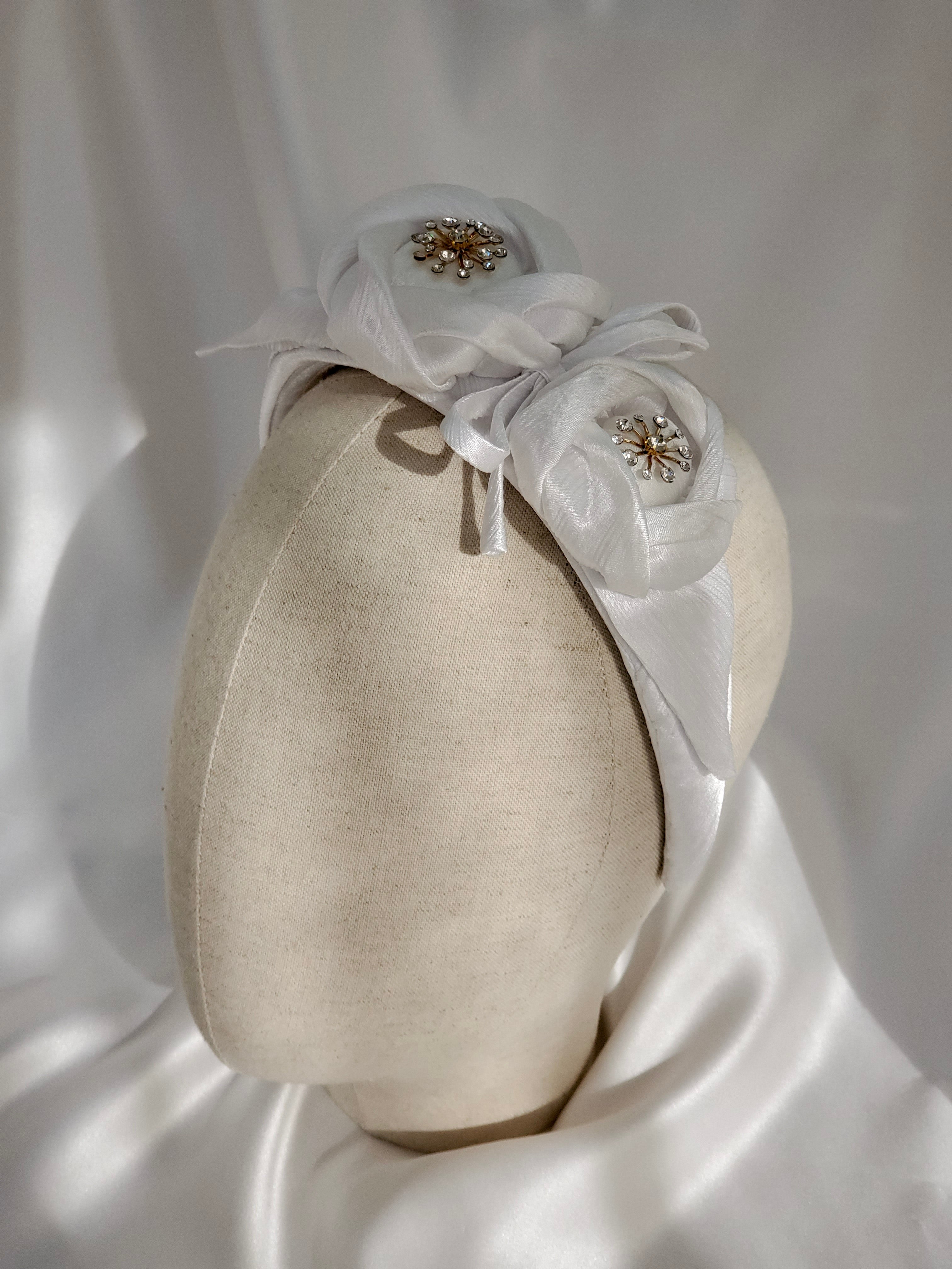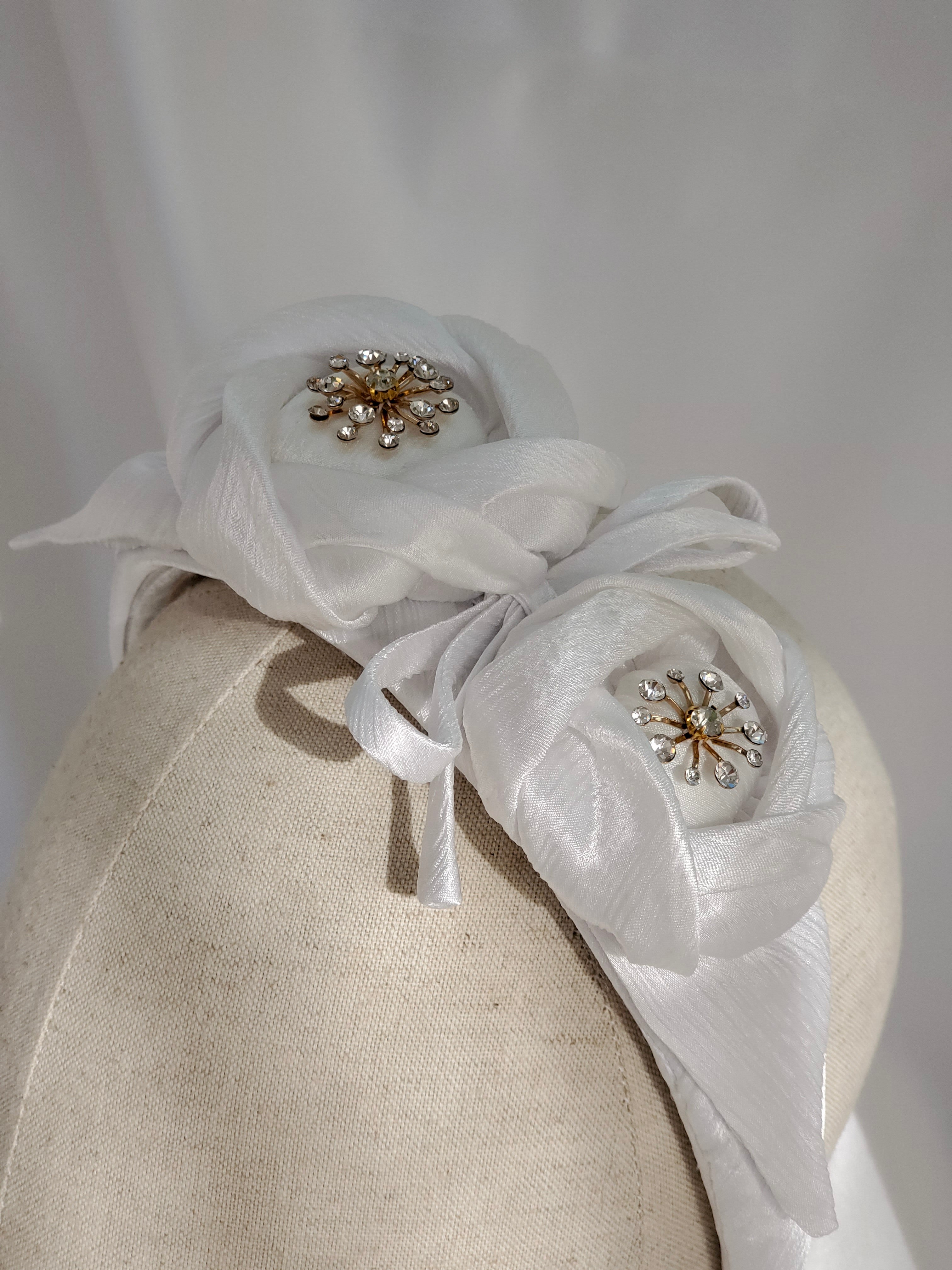 This handcrafted satin headband offers a touch of timeless elegance, featuring two exquisitely hand-formed, three-dimensional roses that add a romantic and artistic flair. Each petal is meticulously shaped from sumptuous satin fabric, creating a lifelike, layered effect. The intricate floral design is further enhanced with carefully placed, sparkling rhinestones that catch the light with every turn.