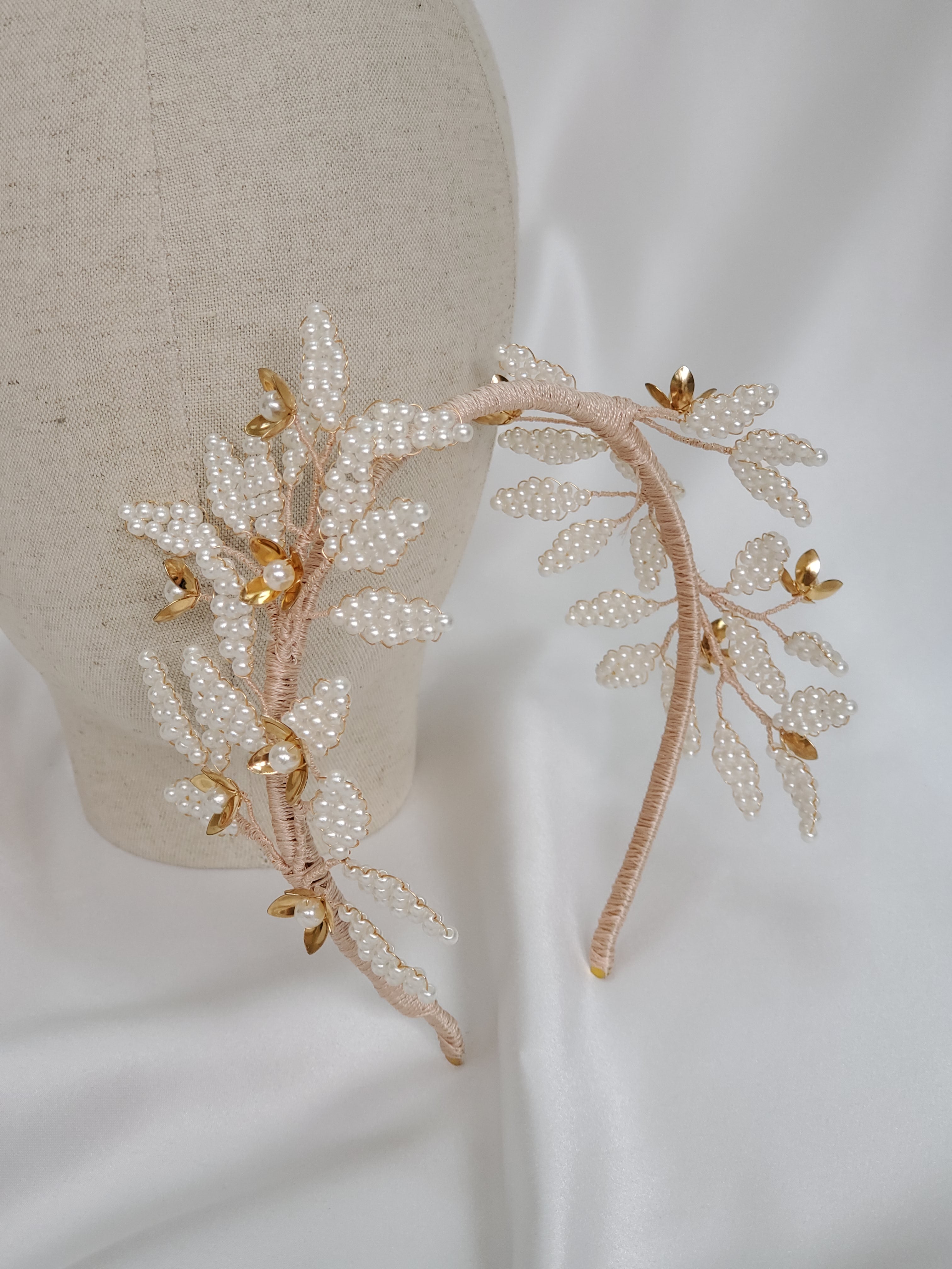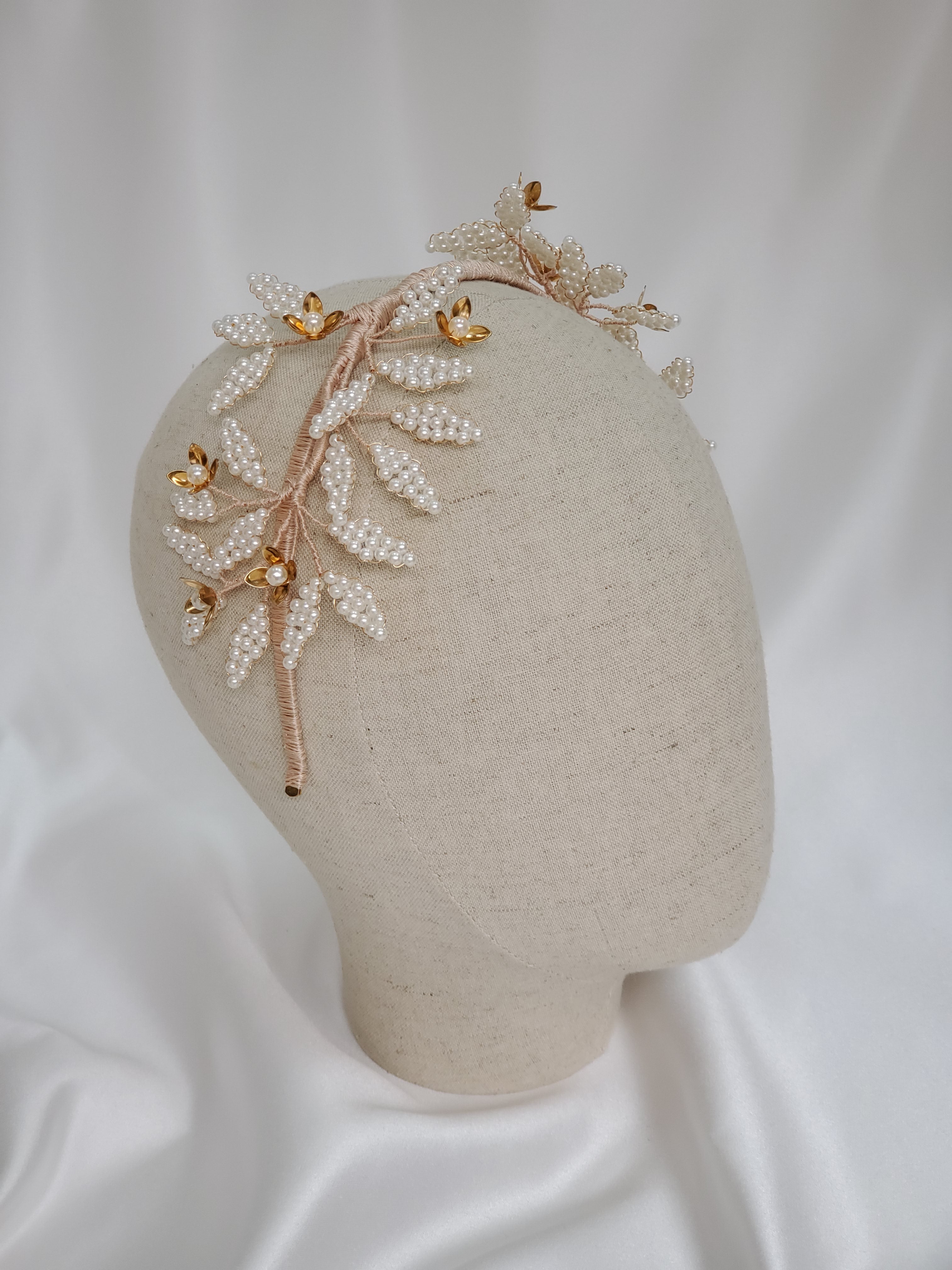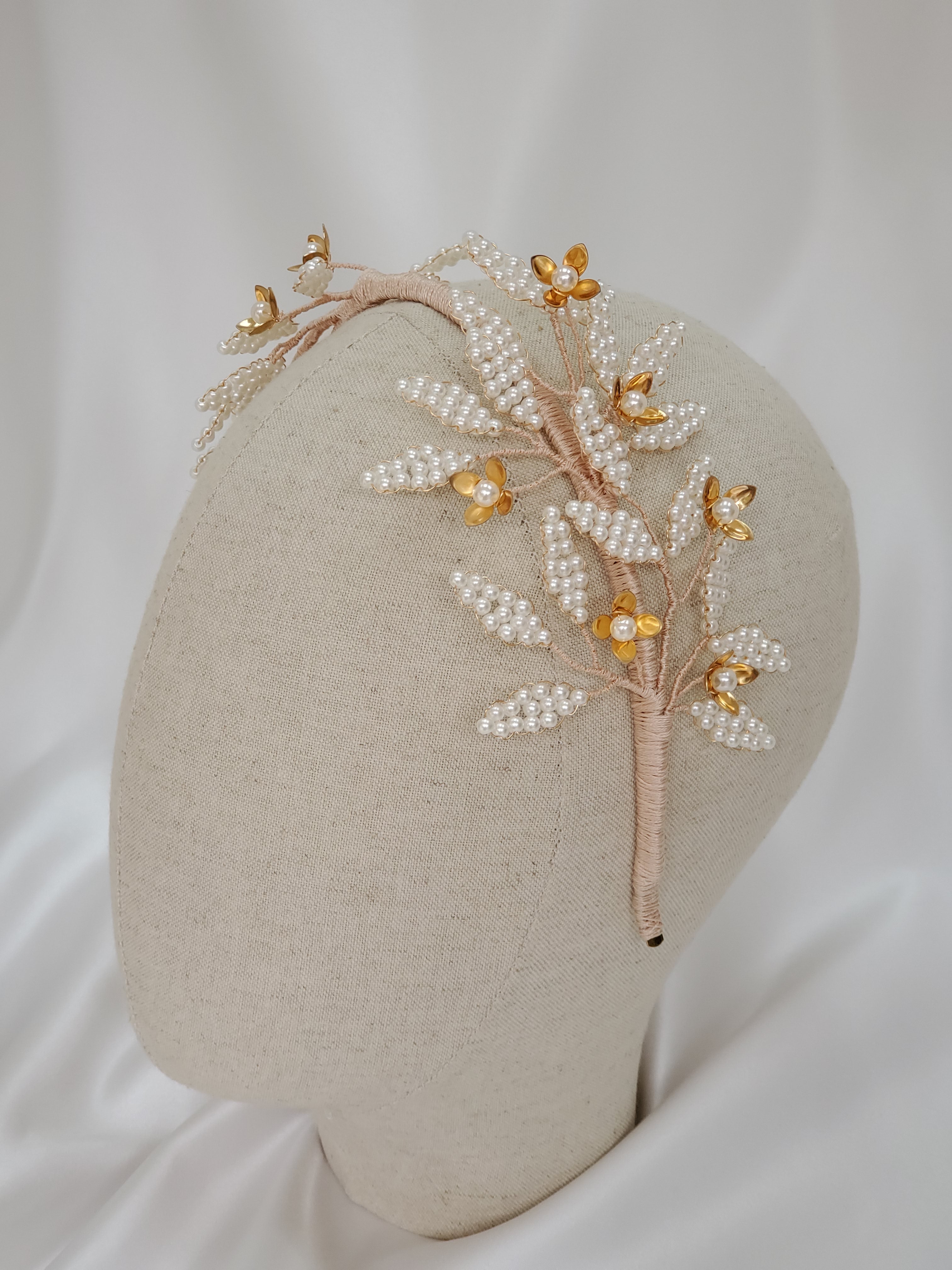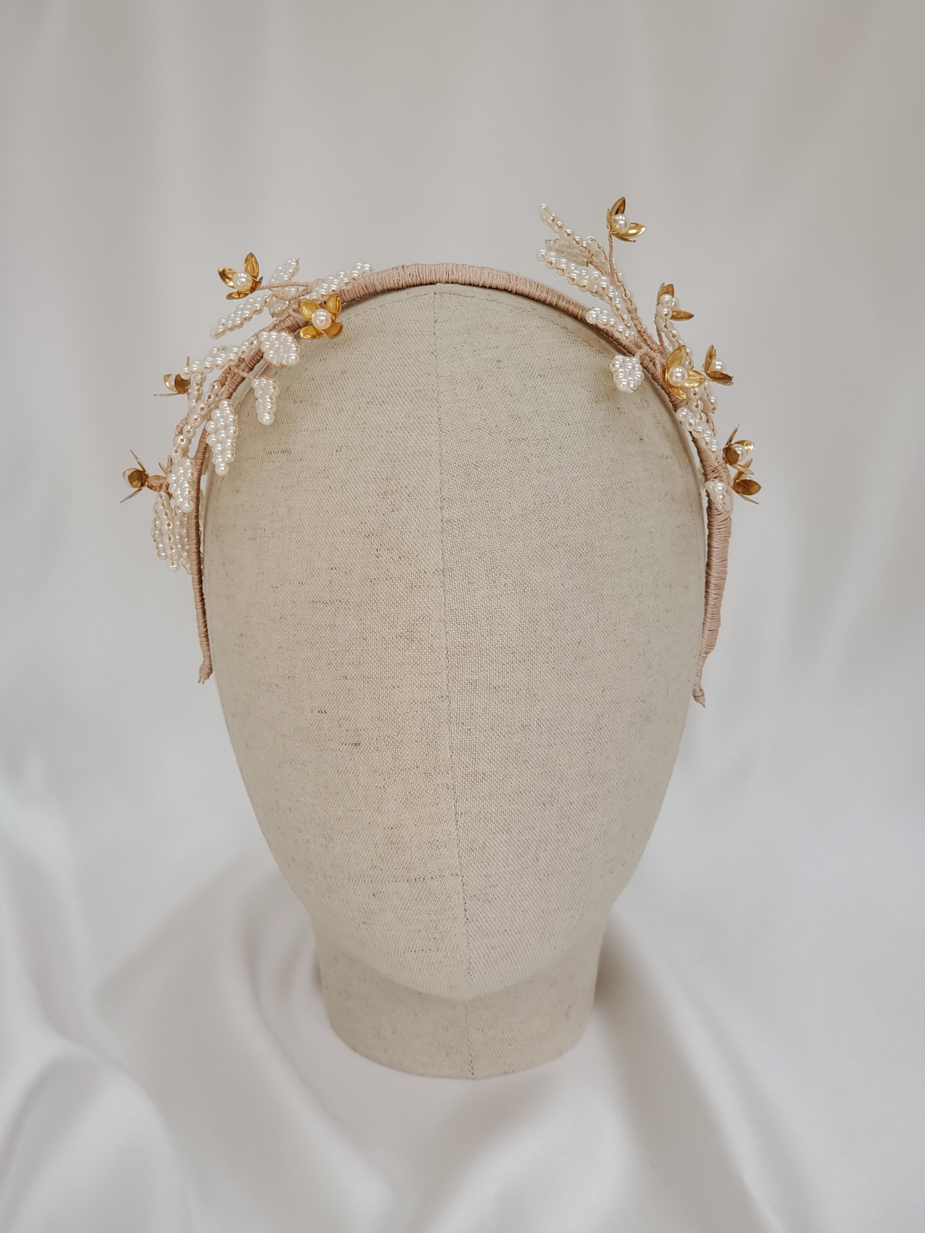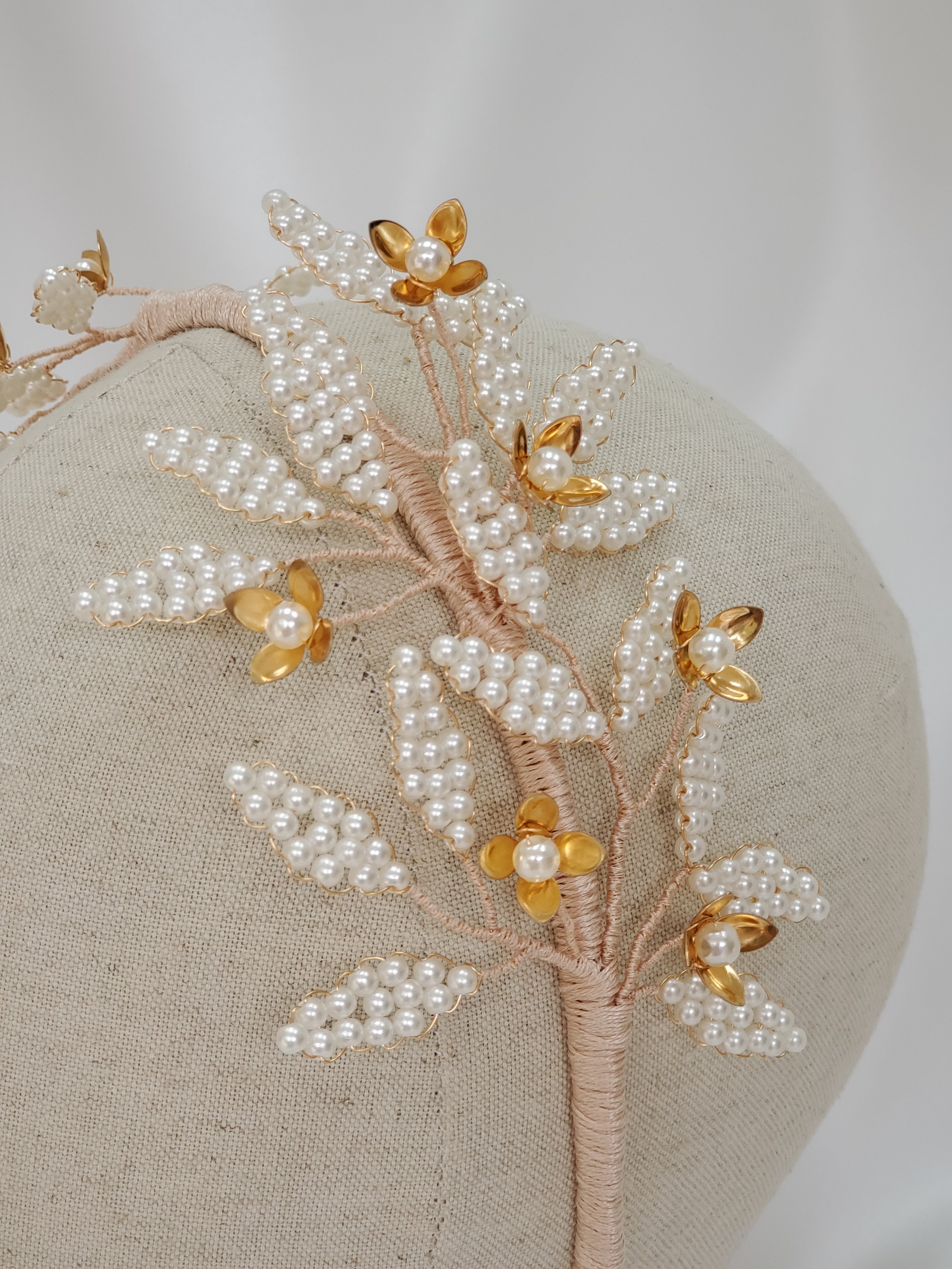 This exquisite headpiece is a labor of love, created using the intricate technique of French beading to form delicate vines of ivory pearls. The meticulous craftsmanship results in a romantic, free-flowing design that gracefully adorns both sides of the head. Golden flowers, each featuring a lustrous pearl center, are artfully placed along the beaded vines, adding a touch of classic elegance. The band is gently wrapped in a nude blush yarn thread, ensuring comfort and a subtle finish that beautifully blends with any hairstyle. A perfect heirloom piece for the romantic bride.